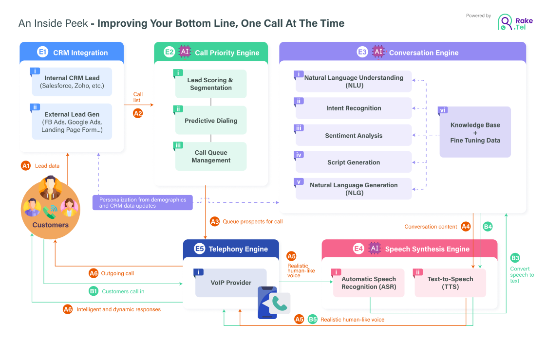 Rake Tel uses advanced Natural Language Processing (NLP), Sentiment Analysis, and Text-to-Speech (TTS) engines that generate realistic conversations. It understands tone, context, and intent, allowing it to speak and respond just like a trained human agent.